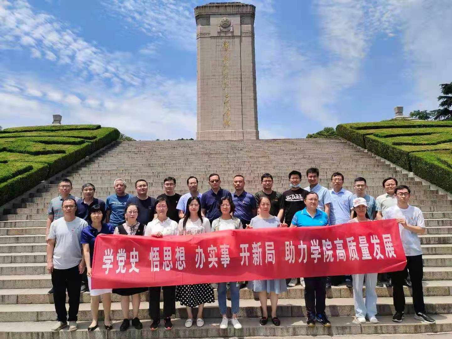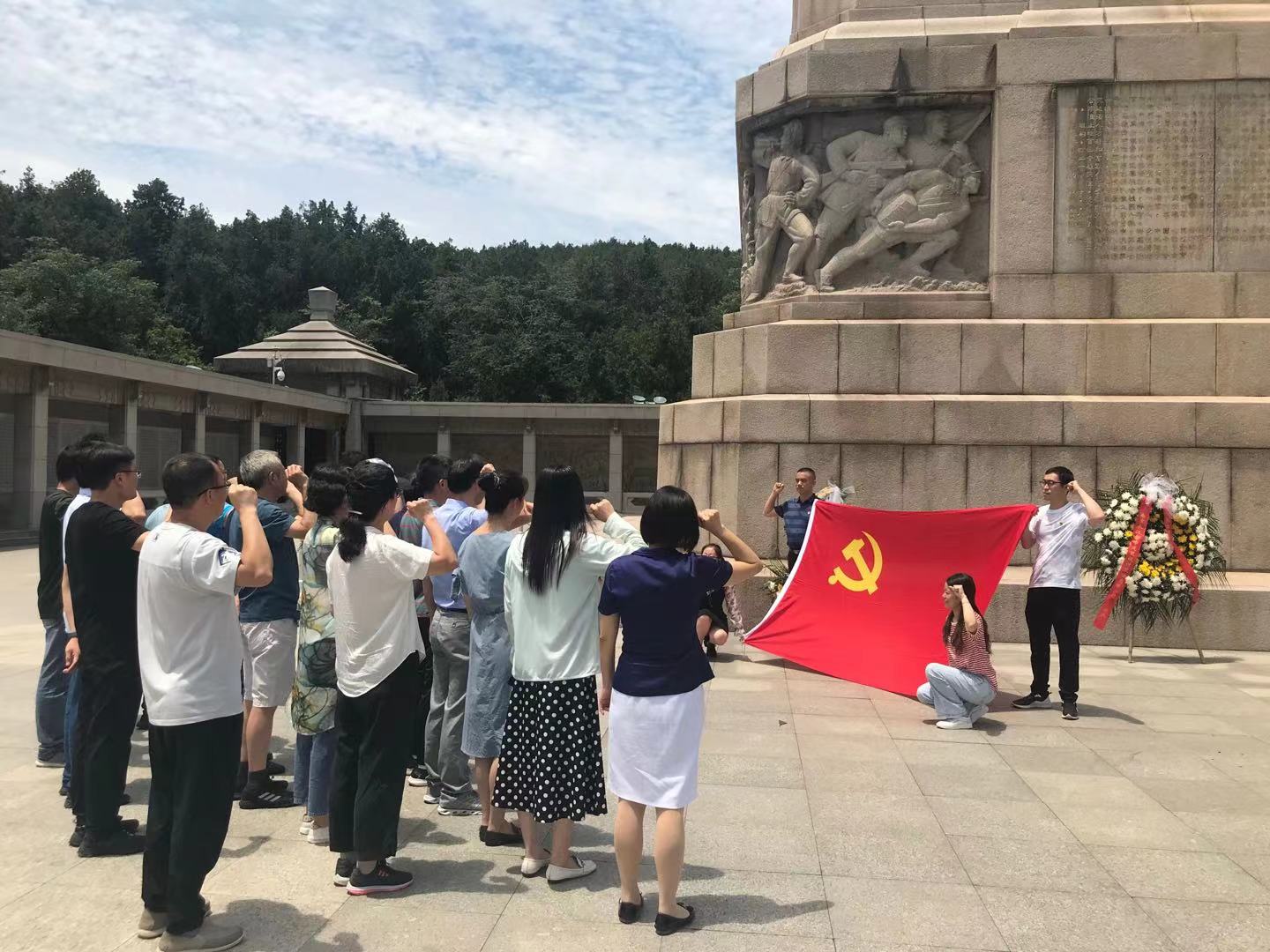 在淮海战役烈士纪念塔前,党员同志们怀着崇敬的心情面向党旗和烈士纪念塔,举起右手庄严宣誓,重温入党誓词,表达了共产党员坚定的共产主义信念和不忘初心、牢记使命、争做合格党员的决心。宣誓后,党员们参观了塔下围廊,墙壁上镌刻着党和国家领导人题词以及三万多名烈士名录,大家肃穆静立,表达对革命先烈的崇高敬意。