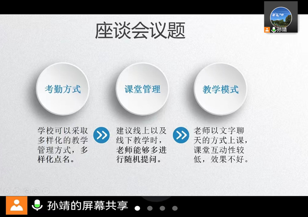 此次座谈会通过教师们的经验分享,顺利解决了线上教学存在的问题,为线上教学质量的提高提供了优化路径。与会教师纷纷表示,要继续探索线上教学新模式新方法,进一步提高线上教学水平。